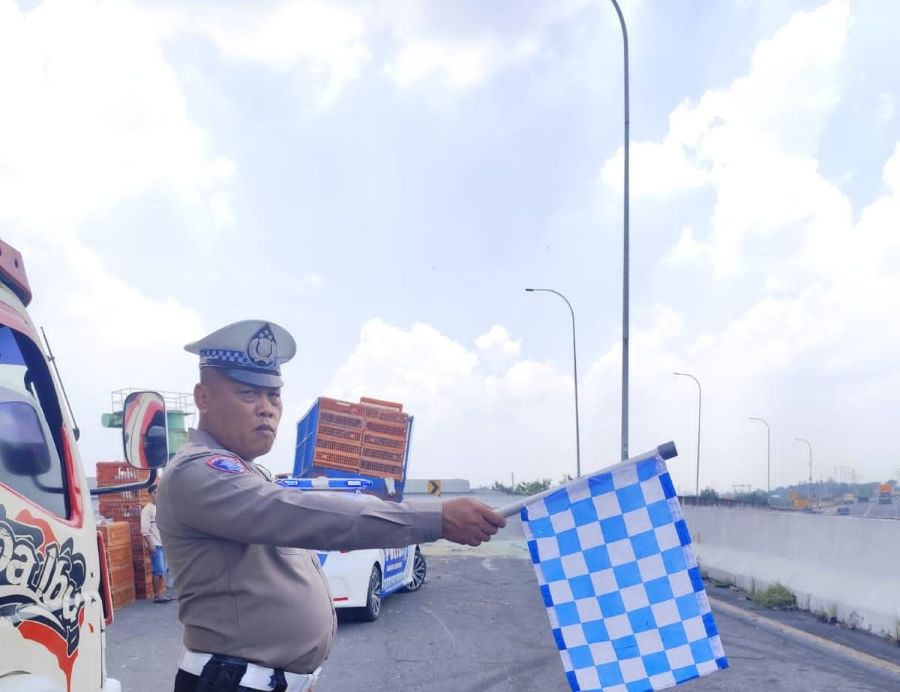 Mojokerto, Diswaymojokerto.id – Sebuah truk pengangkut ayam terguling di area exit Gerbang Tol Penompo, Mojokerto, pada Sabtu, 6 Desember 2025 sekitar pukul 10.25 WIB.