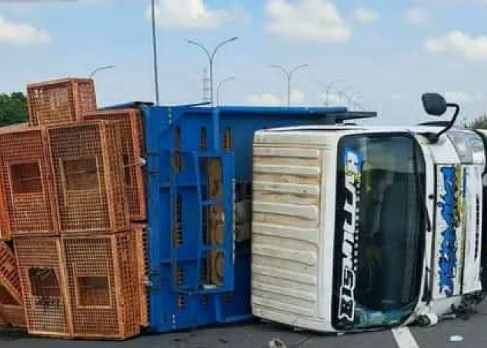 Diduga Akibat Pecah Ban, Truk Bermuatan Ayam Terguling di Exit Tol Penompo Mojokerto