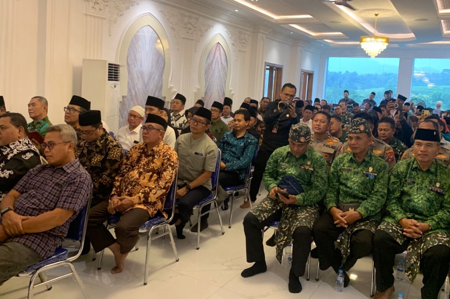 Jajaran forkopimda Kabupaten Mojokerto, tokoh masyarakat, dan organisasi kemasyarakatan mendengarkan pengarahan Menkopolkam di Graha Afia Ponpes amanatul Ummah di Desa Bendunganjati, Kecanatan Pacet, Sabtu, 14 Februari 2026.-andung - disway mojokerto-