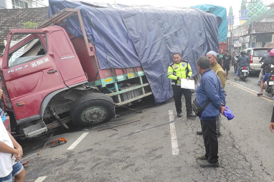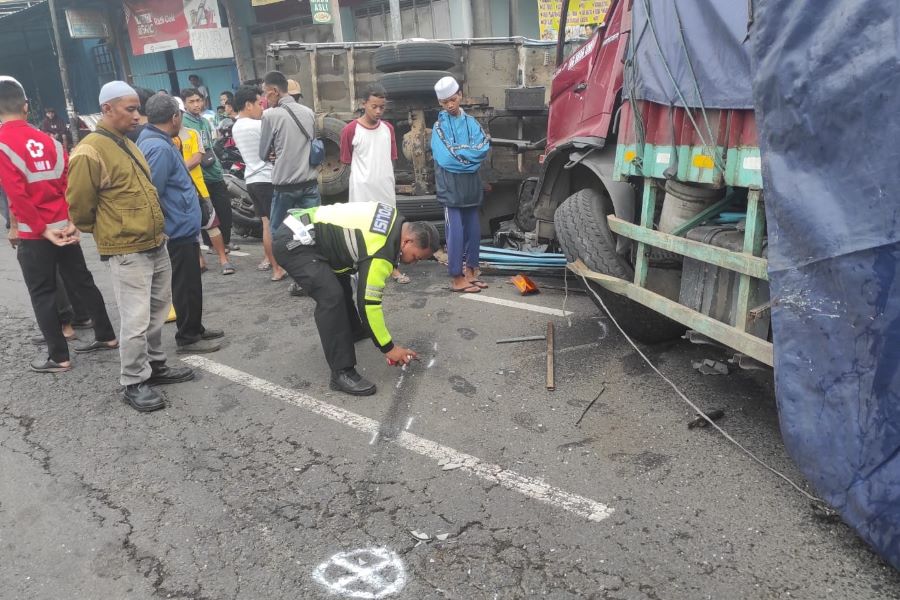 "Sesampainya di TKP, pengemudi truk gandeng diduga mengantuk sehingga kendaraannya oleng ke kanan kemudian menabrak truk tractor head dan truk truk bernopol K 9318 AC. Truk tersebut kemudian terguling dan menimpa sepeda motor," jelasnya.