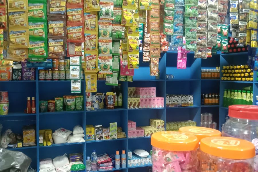 Warungnya tidak luas, namun padatnya luar biasa. Etalase kaca di depan memajang rokok yang tersusun rapi, sementara rak kayu di belakangnya sesak oleh mi instan, sabun, hingga saset kopi yang menggantung rapi.