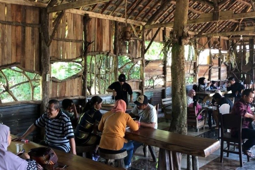 Kelompok mahasiswa dan rombongan keluarga besar mendominasi pemandangan di area makan outdoor maupun indoor.