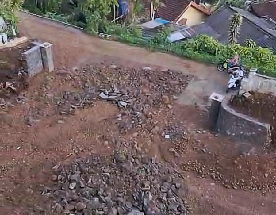 Material yang menutup badan jalan mengakibatkan jalur menjadi licin dan berpotensi membahayakan pengendara. Warga bersama petugas gabungan kemudian melakukan pembersihan manual menggunakan alat kerja bakti.