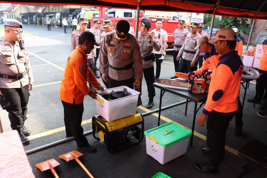 Selain melakukan pemeriksaan pasukan, ia juga meninjau secara langsung perlengkapan dan kendaraan taktis yang akan digunakan dalam penanganan darurat bencana, seperti perahu karet, alat evakuasi, dan perlengkapan medis.