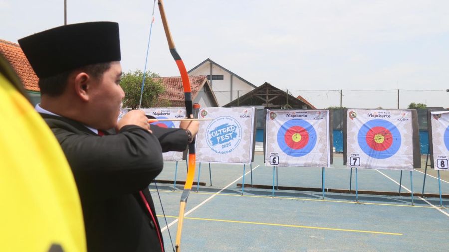 Bupati Al Barra mencoba olah raga panahan-Foto : Kominfo Pemkab Mojokerto-