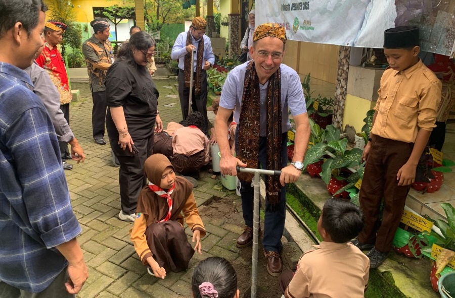 Cristian Susan (mengenakan blangkon, di laytar belakang Salil Dutt) dari UNIDO mencoba membuat lubang bipori menggunakan alat bor pemberian Proyek Mewlafor di SDN Pandan, Kecamatan Pacet, Jumat, 19 Desember 2025.-andung - disway mojokerto-