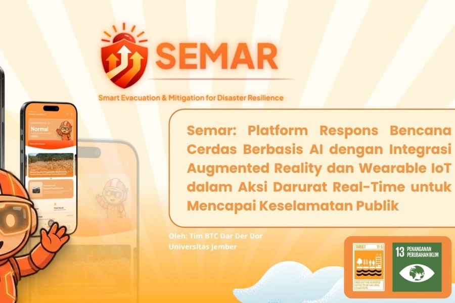 Sementara, pada kategori UI/UX Competition, tim mengembangkan produk digital bernama SEMAR (Smart Evacuation & Mitigation for Disaster Resilience). Platform ini merupakan platform kesiapsiagaan bencana yang dirancang untuk membantu masyarakat merespons situasi darurat secara cepat, tepat, dan aman.