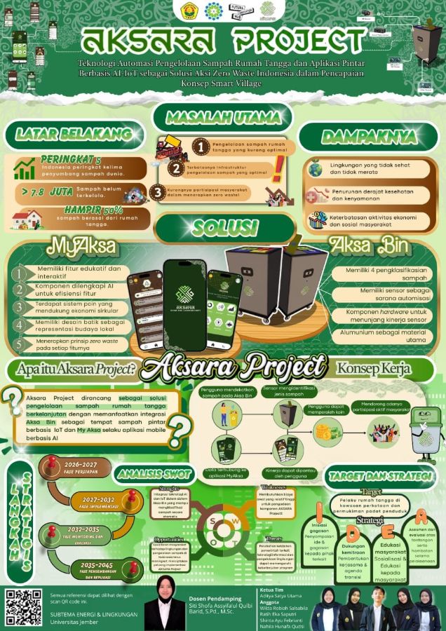 Poster Aksara Project: Teknologi Automasi Pengelolaan Sampah Rumah Tangga dan Aplikasi Pintar Berbasis AI-IoT sebagai Solusi Aksi Zero Waste Indonesia dalam Pencapaian Konsep Smart Village-Foto : Humas Universitas Jember-