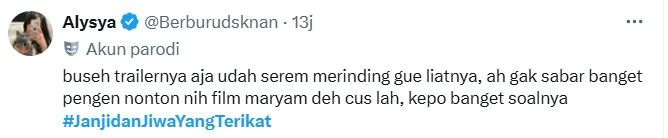 Sementara akun @Berburudsknan menambahkan: “buseh trailernya aja udah serem merinding gue litanya, ah gak sabar banget pengen nonton nih film Maryam deh cus lah, kepo banget soalnya.” Komentar-komentar serupa membanjiri lini masa, menandakan tingginya rasa penasaran penonton terhadap film ini.