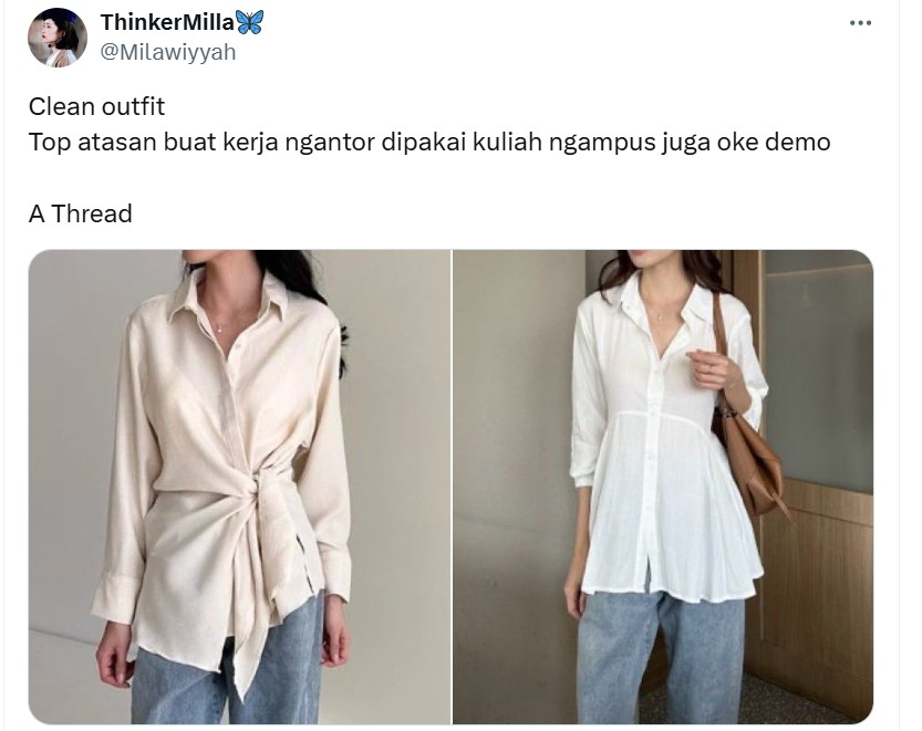 Fenomena ini juga terlihat jelas di media sosial. Banyak akun membagikan inspirasi clean outfit yang bisa dipakai untuk berbagai kesempatan, mulai dari kuliah, nongkrong, hingga bekerja. Misalnya, akun X bernama @Malawiyyah menulis, “Clean outfit top atasan buat kerja ngantor dipakai kuliah ngampus juga oke demo''.