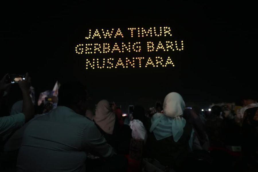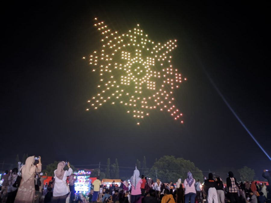 Pertunjukkan lampu dengan menggunakan drown di puncak acara PRB 2025 di Trowulan Mojokerto-Foto : Satriya Al Fauzi Magang-