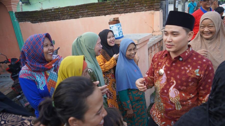 Gua Barra menyapa ibu-ibu pada acara penyerahan bantuan akibat angin kencang-Foto : Kominfo Pemkab Mojokerto-