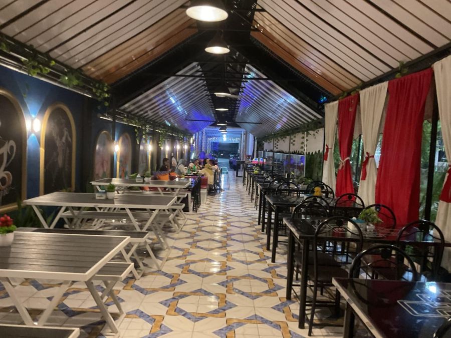 Dari area terbuka, pengunjung juga dapat menikmati danau buatan yang menjadi daya tarik utama kafe ini. Pemandangan tersebut tampak semakin memikat saat sore hari dengan langit yang mulai jingga. Sementara di malam hari, kafe menjadi lebih semarak dengan adanya live musik sebagai hiburan tambahan.