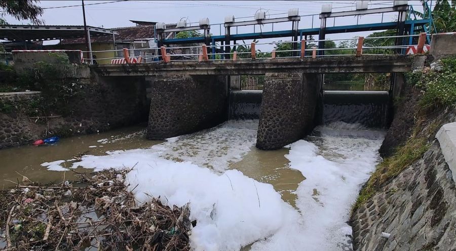 Tumpukan busa berwarna putih itu menggumpal dan menumpuk di aliran sungai, bahkan terlihat jelas dari atas jembatan. Busa tersebut tersangkut pada tumpukan sampah di sungai. Saat angin bertiup kencang, busa beterbangan ke atas permukaan dan menyebar ke sekitar area sungai.