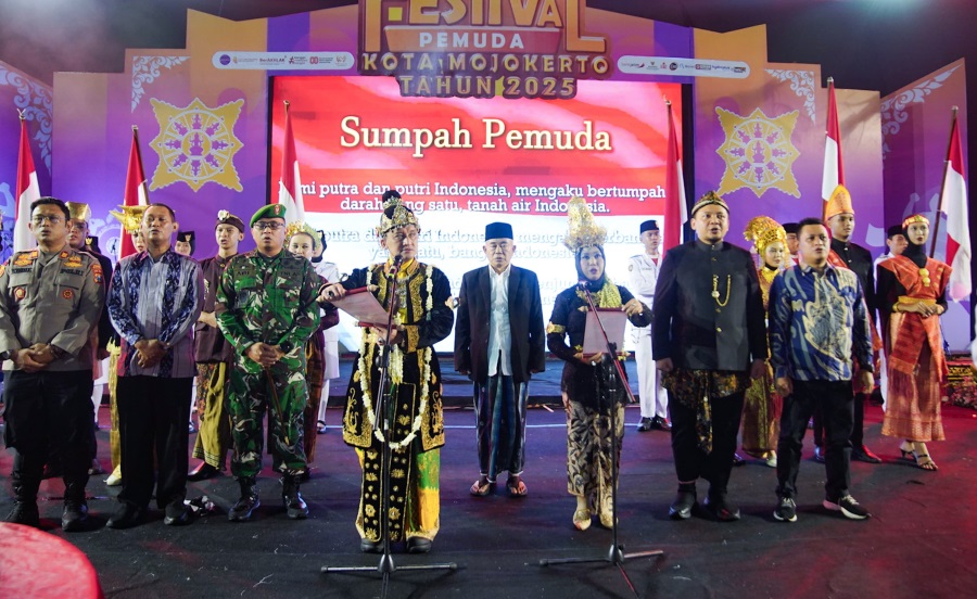 Puncak acara peringatan Hari Sumpah Pemuda di Kota Mojokerto dilaksanakan di Taman Bahari Majapahit, Selasa, 28 Oktober 2025, malam. Wali Kota menekankan, pemuda Mojoketo adalah pewaris genetika Majapahit yang unggul-dok Diskominfo Kota Mojokerto for Disway Mojokerto-